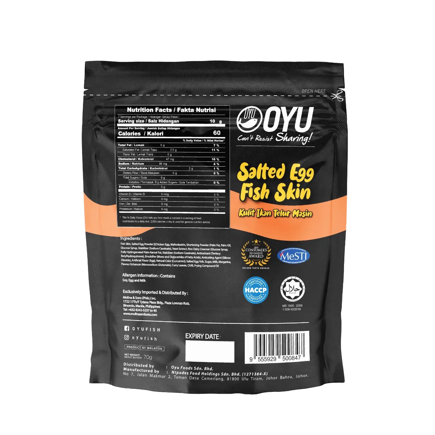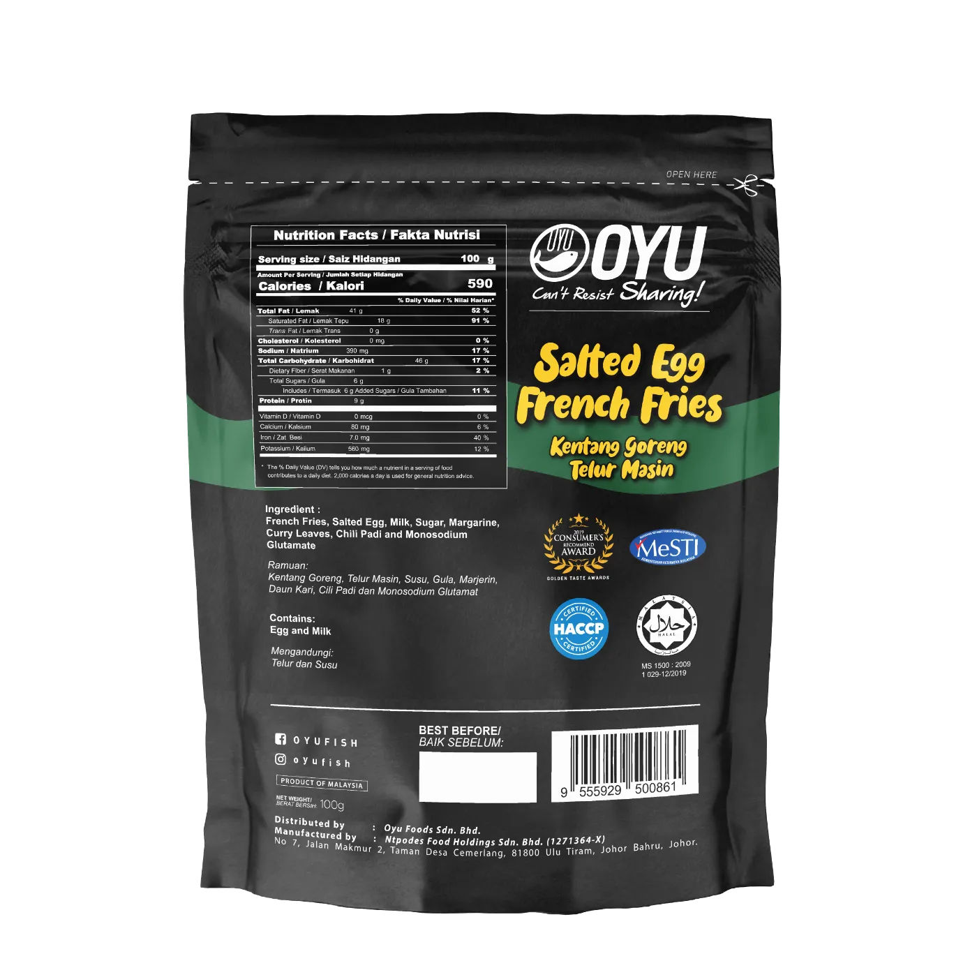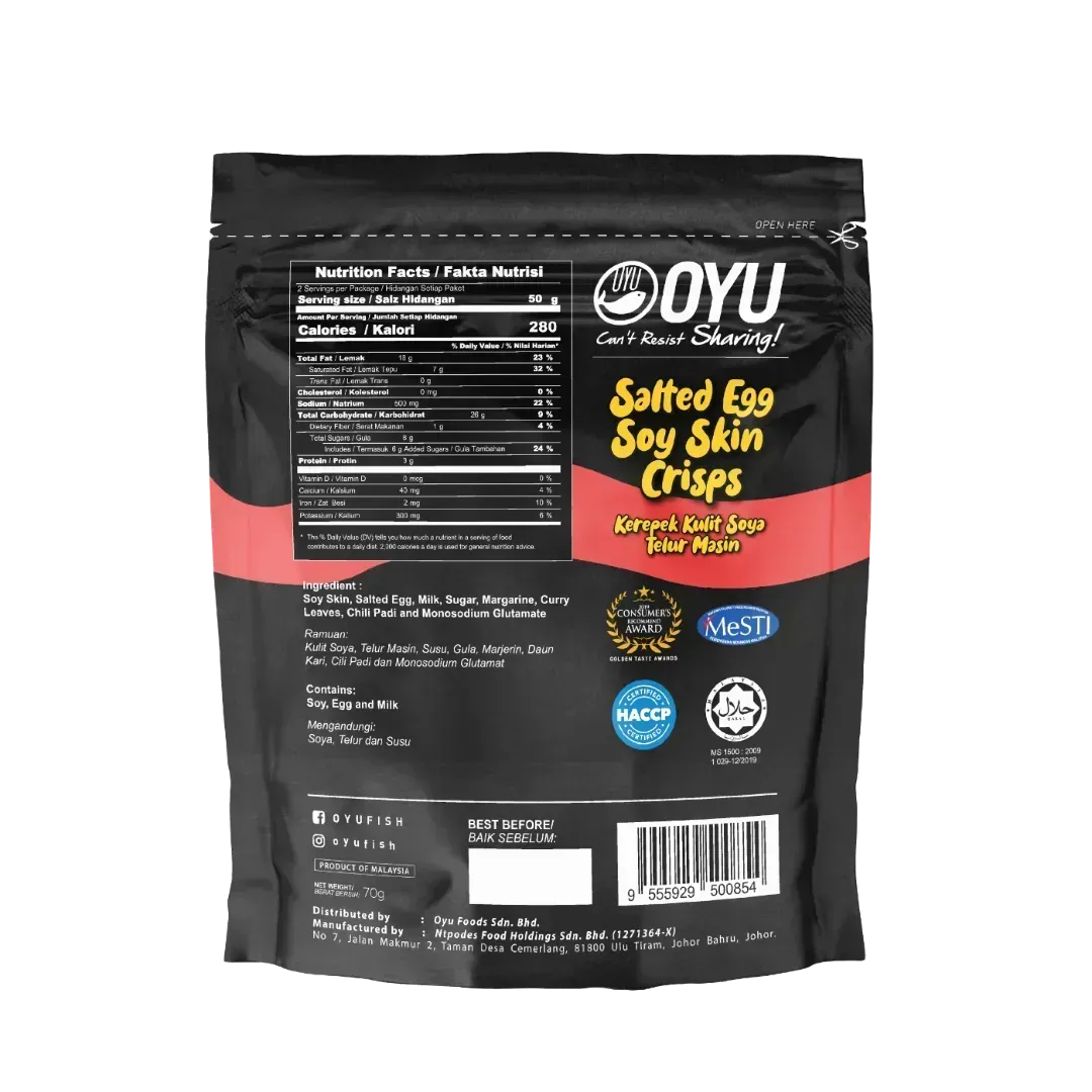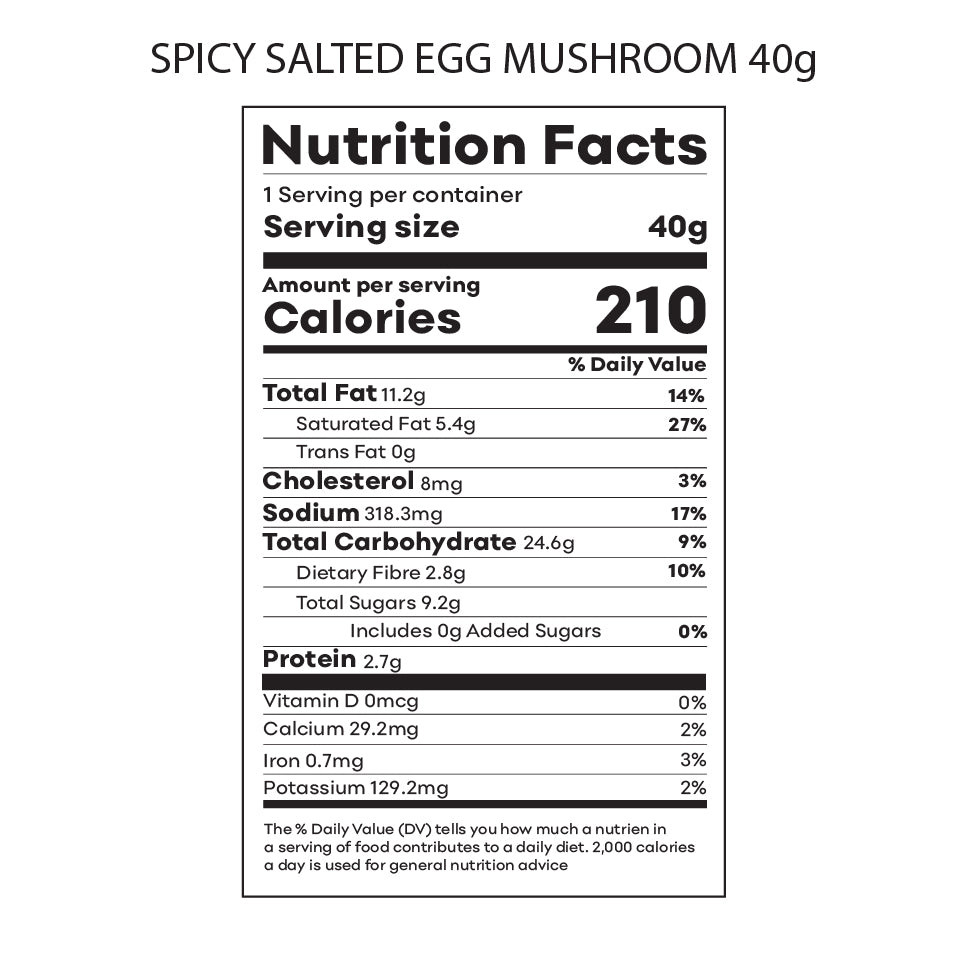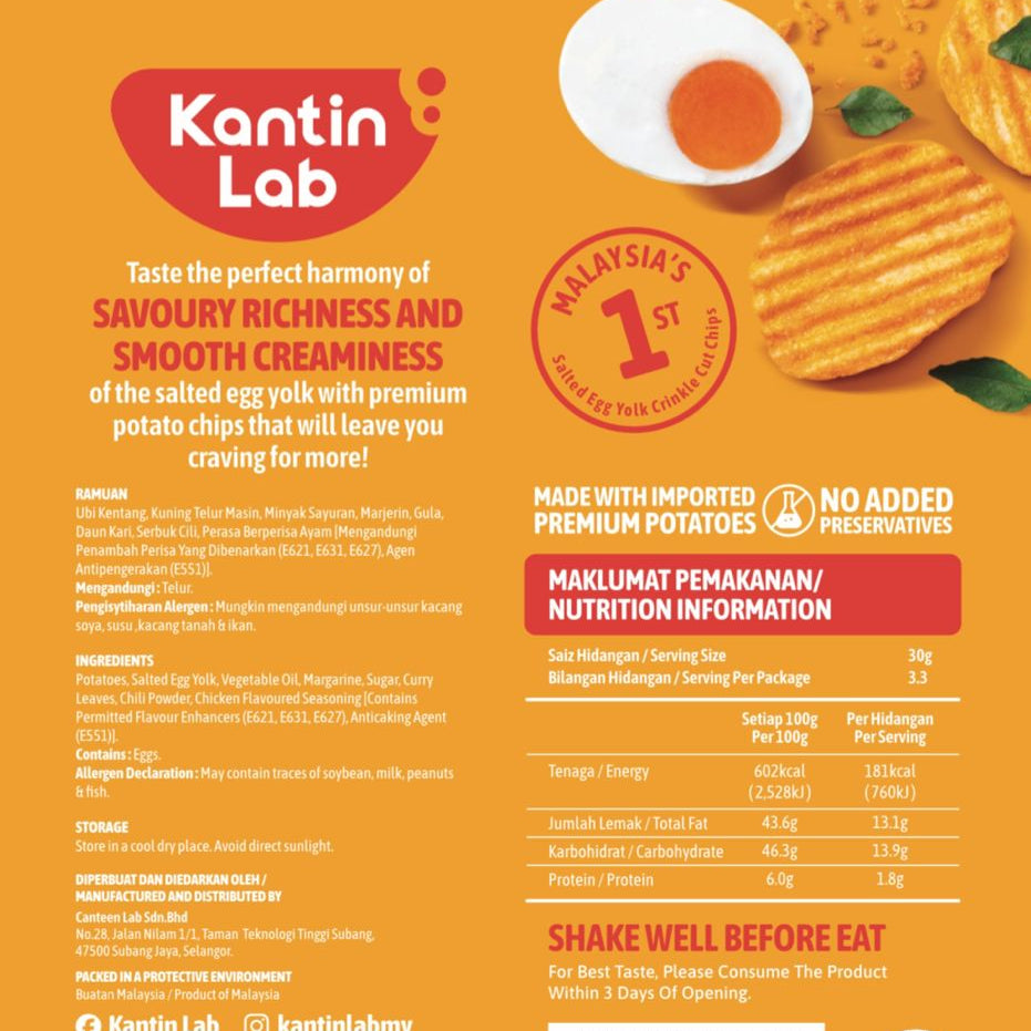 Ingredients: Spring Roll Pastry (47.5%), Salted Egg Yolk (30.5%), Butter, Sugar, Curry Leaf